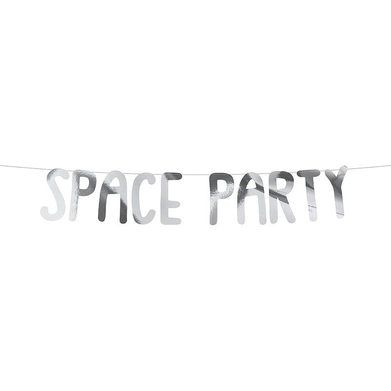 Sewn Banner Space - Space Party, Made Of Mirror Silver Paper, Size: Height Approx. 13cm, Length Approx. 96cm.
